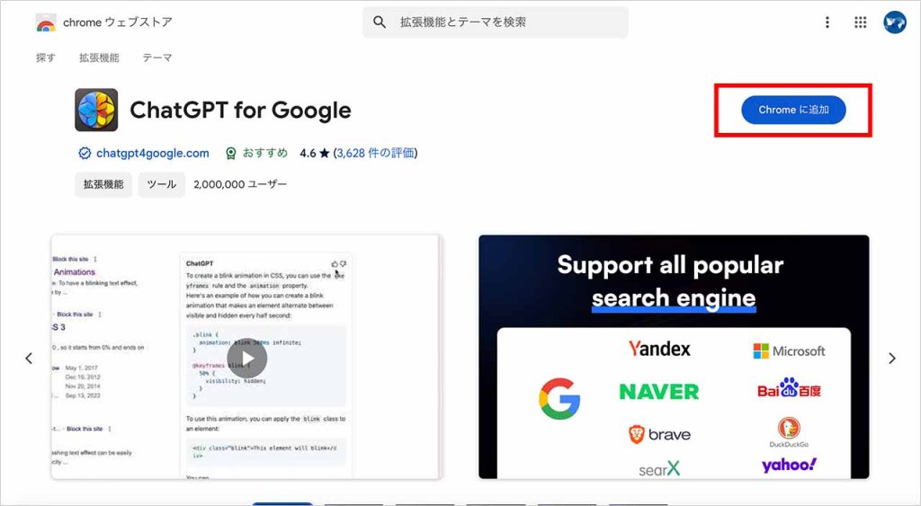 ChatGPT for Googleの紹介ページが表示されたら、「Chromeに追加」をクリックするだけで拡張機能の導入は完了です。