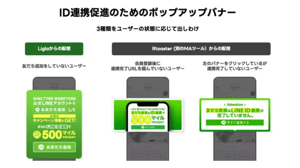 友だちではないユーザーがECサイトを訪れる際、Liglaを使ってID連携を促すポップアップを表示させ、ユーザーのID連携の状態に応じて、ユーザーのID連携の状況に合わせてリッチメニューを出し分けしました。