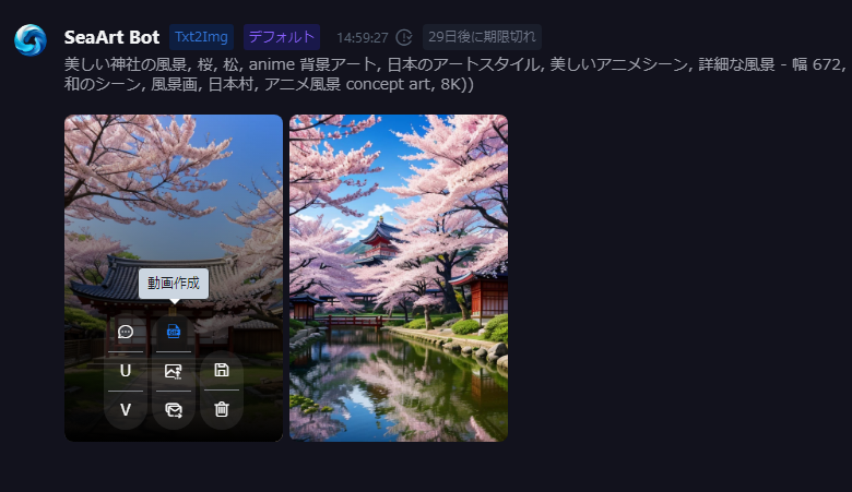 たとえば、「美しい神社の風景, 桜, 松, anime 背景アート, 日本のアートスタイル, 美しいアニメシーン, 詳細な風景 – 幅 672, 背景アート, アニメ風景, アニメの背景, 美しいアニメシーンry, アニメの美しい平和のシーン, 風景画, 日本村, アニメ風景 concept art, 8K))」と入力した結果は以下のとおりです。