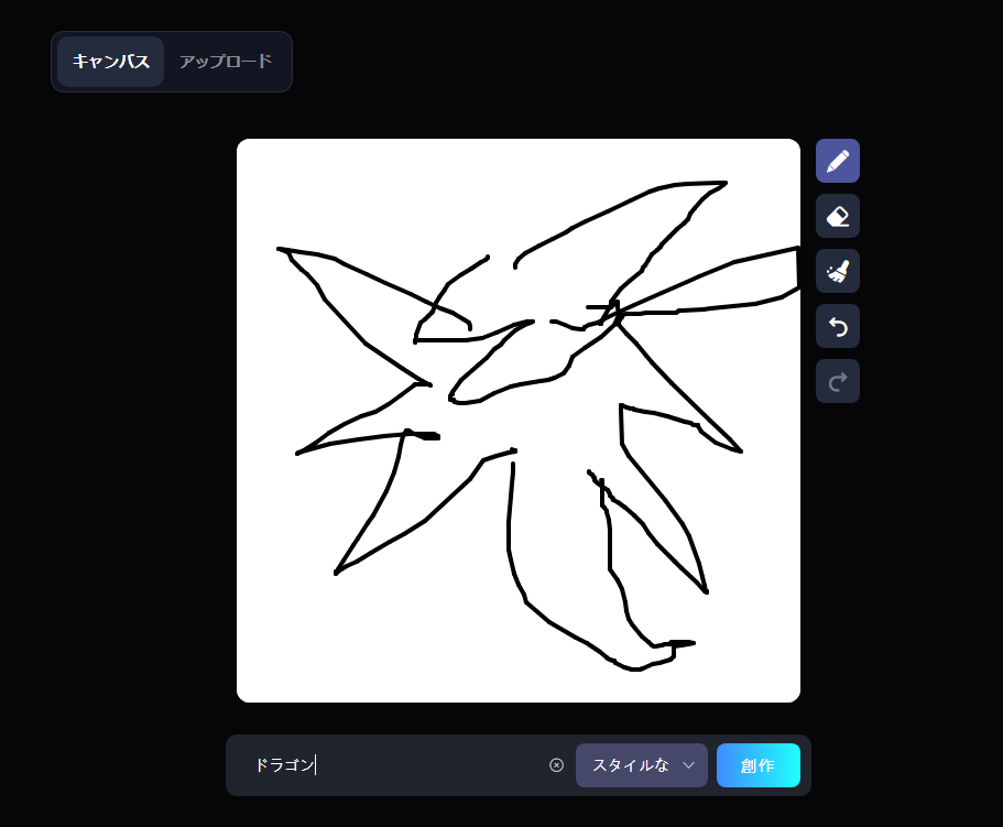 「下絵仕上げ」とは、わずかな筆跡でハイレベルな画像を生成する機能です。参考までに、ドラゴンをイメージした下書きで試した結果は以下の通り。