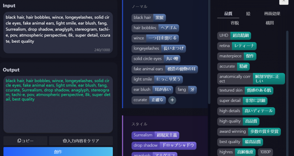 SeaArtにおける「創作」とは画像生成のことです。他のサービスと同様、プロンプトを入力することで画像が生成される「Text-to-Image」を搭載しています。