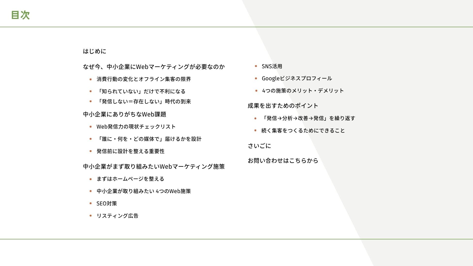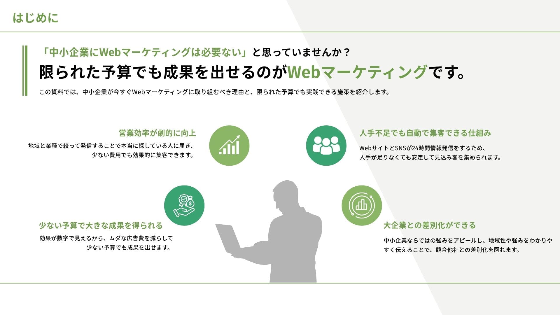 本資料では、中小企業が最短で集客不足から抜け出すためのWebマーケティング戦略をまとめています。