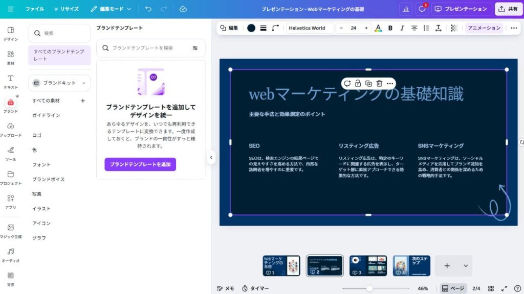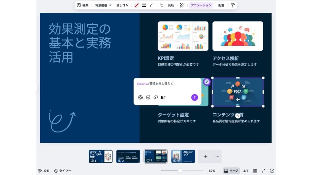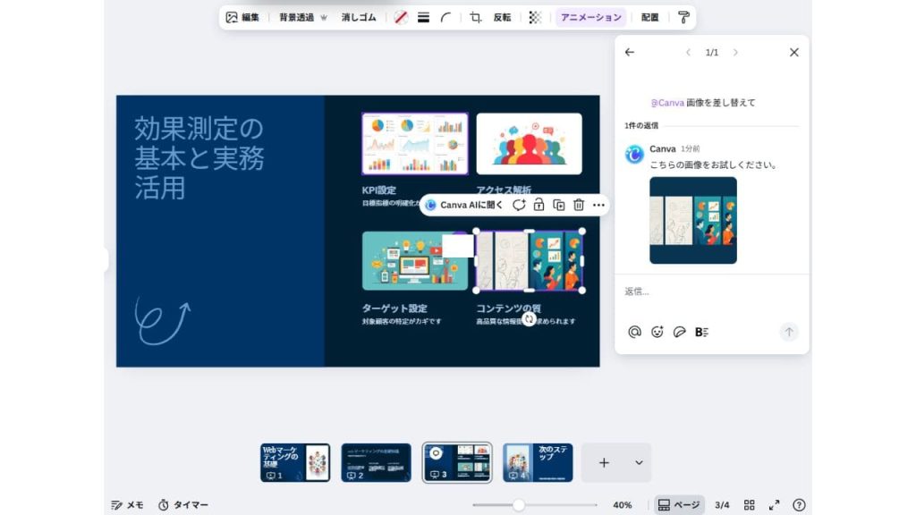 Canvaはもともとがデザインツールであるため、AIが生成したスライドを、ドラッグ&ドロップの簡単な操作で編集できます。