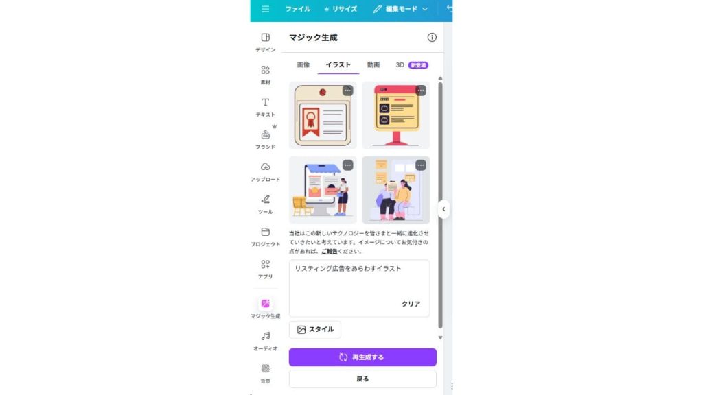 マジック生成機能を活用すれば、AIが資料のテイストに合った図解や挿絵を自動生成してくれます。例えば、「リスティング広告を表すイラスト」と指示を出した結果は以下の通りです。