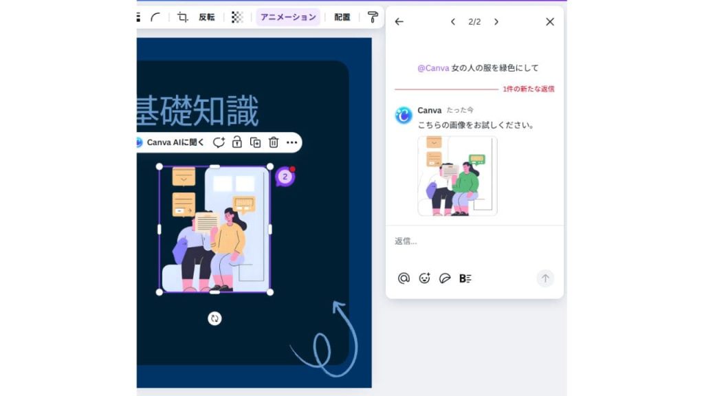 また、生成された素材の色を変えたり、一部を切り抜いたりしたい場合は、デザインを選択して「Canva AIに聞く」から「緑色にして」「○○をなくして」などと指示を出せば自動で調整してくれます。