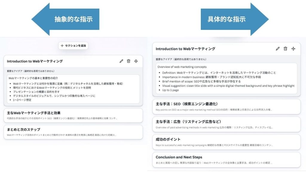 実際に、「Webマーケティングの資料を作って」「1.Webマーケティングとは 2.主な手法(SEO、広告) 3.成功のポイントで資料を作成」の2パターンのプロンプトの精度を比較してみました。後者の方が、資料の全体像を正確に反映した構成になっています。