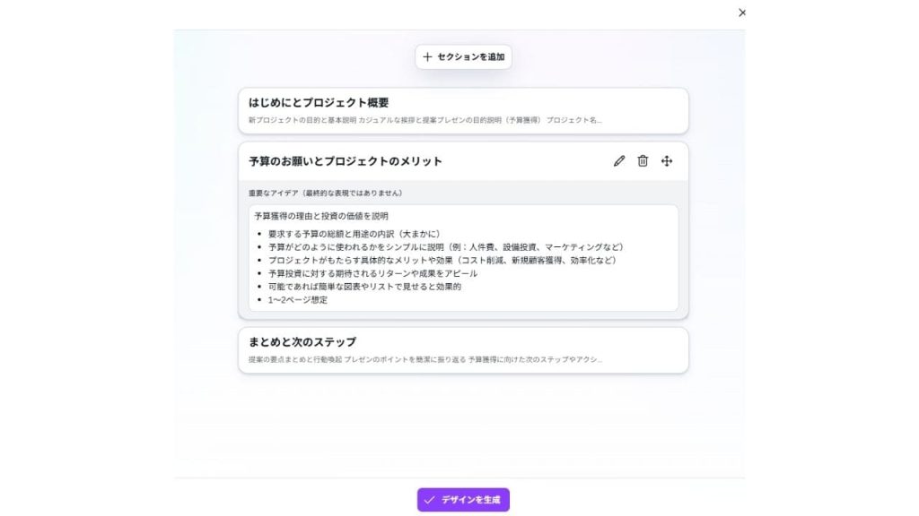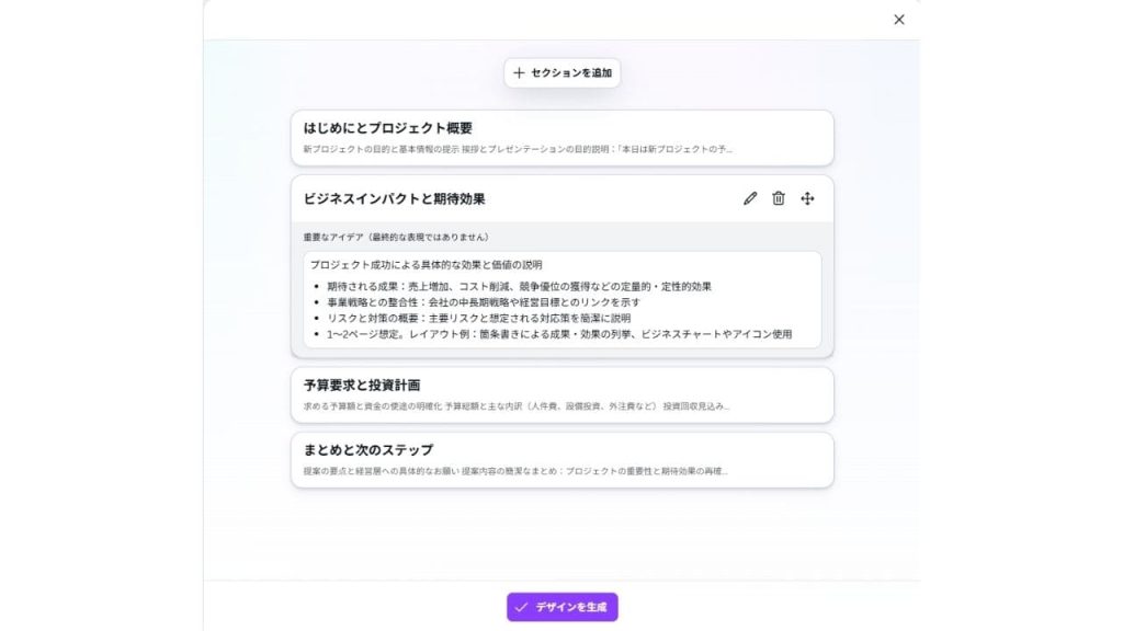 指示に基づき、AIが数秒で構成を提案してくれます。提案された内容で問題なければ、「デザインを生成」をクリックします。修正を加えたい場合は、AIに追加で指示を出したり、各セクションの右側にある「セクションを編集」で直接編集したりすることが可能です。