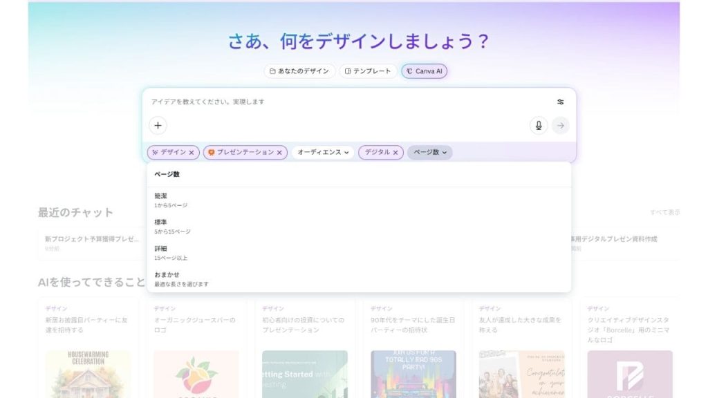 適切な枚数が分からない場合は、「ページ数→おまかせ」を選択すれば、AIが内容のボリュームに応じて最適な枚数を提案してくれるので、目的に合わせて調整すると良いでしょう。