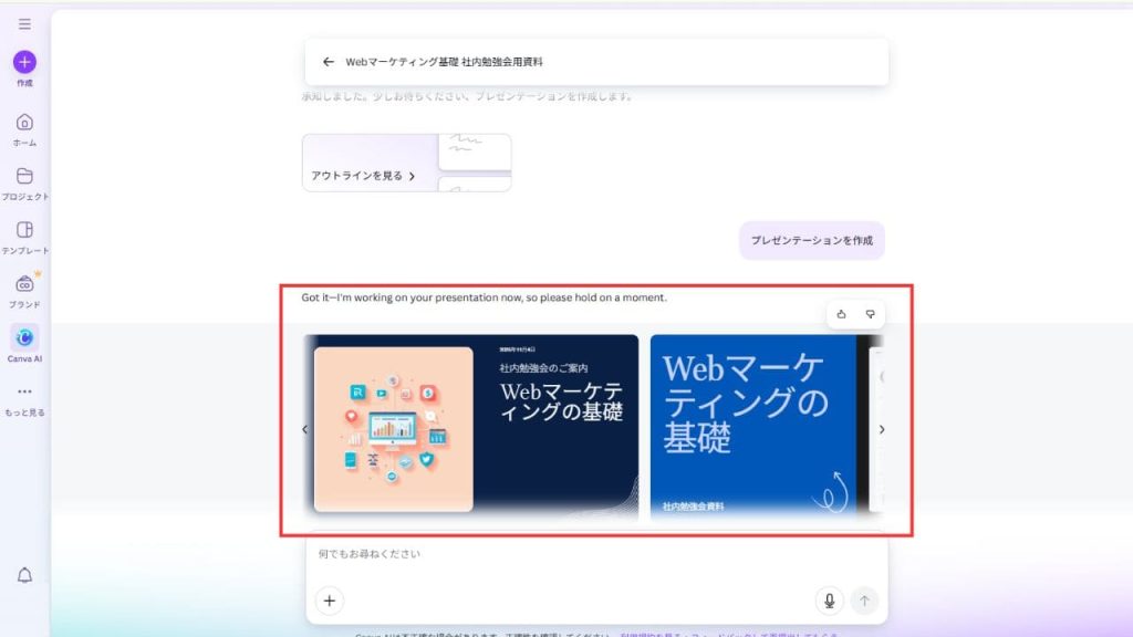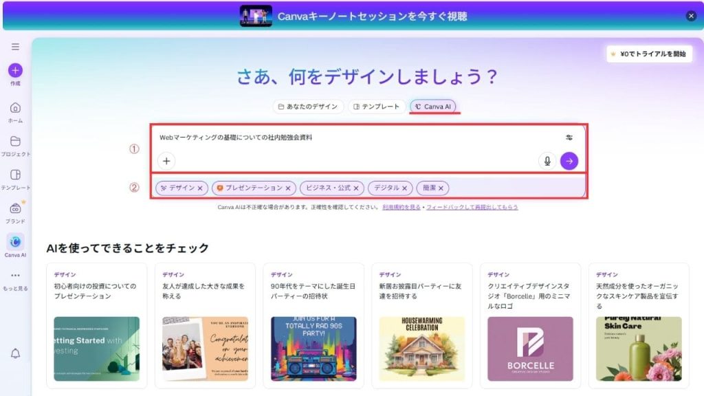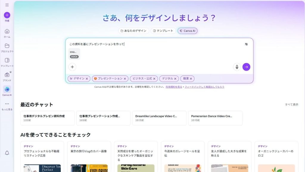 まず、Canvaのホーム画面にある「Canva AI」を選択し、テキストボックスに作成したい資料のテーマを具体的に入力します。(例:「Webマーケティングの基礎についての社内勉強会資料」「新商品の販促企画に関する提案書 5枚程度」)