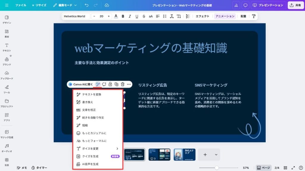 AIが生成したテキストが「少し堅苦しいな」「もっと要点をまとめたい」と感じる場合、修正したいテキストを選択してCanva AIのマジック作文機能を使います。