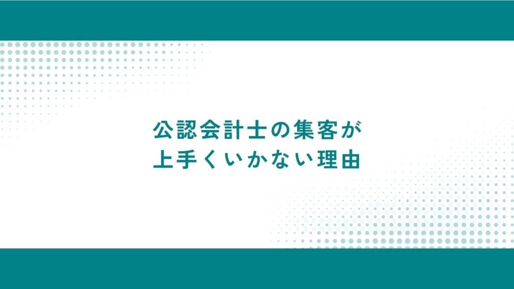 公認会計士の集客がうまくいかない理由としては、サービス内容の伝わりにくさや競合との区別がつきにくいことがあげられます。取り組み方によっては、誰をターゲットにしているか曖昧なことも考えられ、どれか一つでも当てはまると集客効果は大きく下がります。