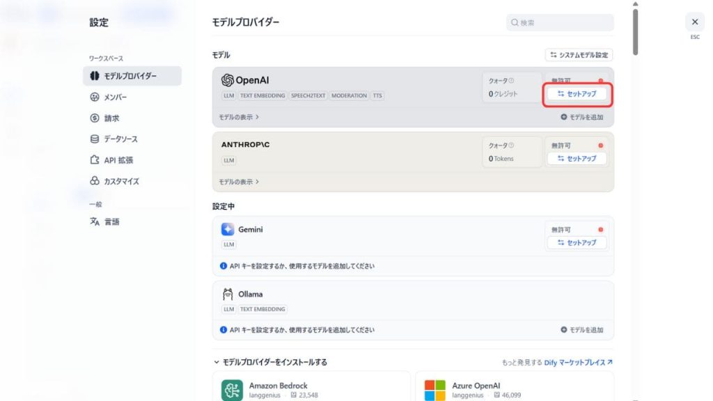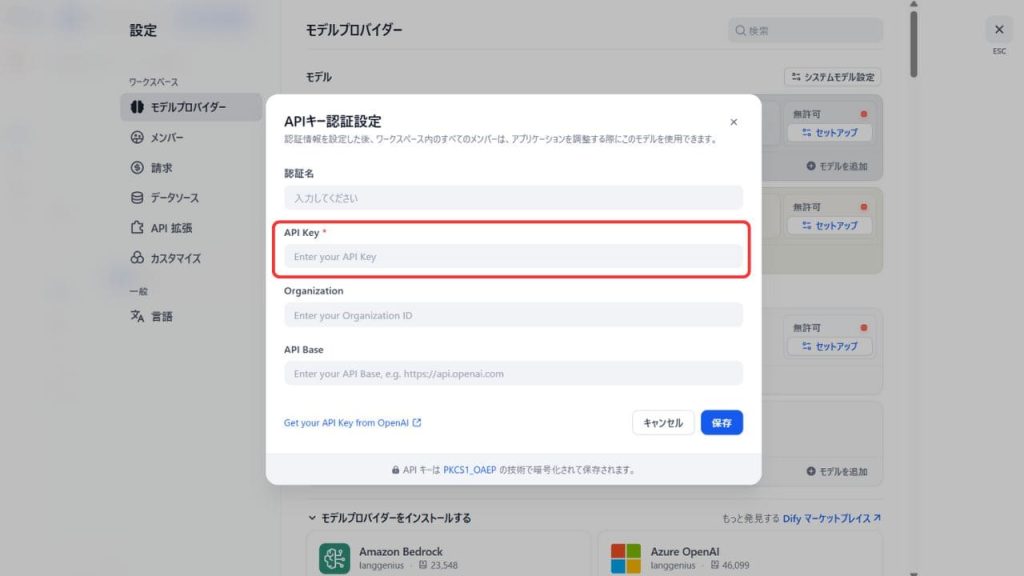 次に、AIモデルを利用するためのAPIキーを設定します。画面左のメニューから「設定」>「モデルプロバイダー」へ進みます。OpenAIやAnthropic(Claude)など、利用したいAIサービスのプロバイダーを選択し、事前に取得しておいたAPIキーを入力して保存します。これで、Dify上でAIが使えるようになります。