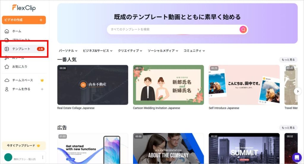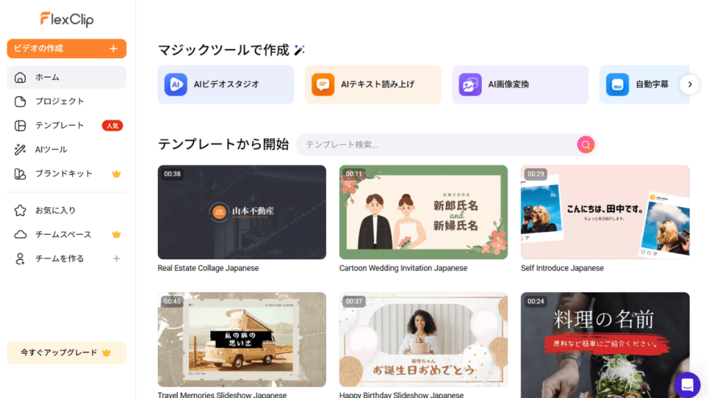 FlexClipは、初心者でも使いやすい直感的なUIが特徴の動画制作・編集ツールです。誰でもプロクオリティの動画が気軽に作れるよう、たくさんのテンプレートが用意されており、ドラッグ・ドロップ操作で使いやすい編集機能も多く搭載されています。