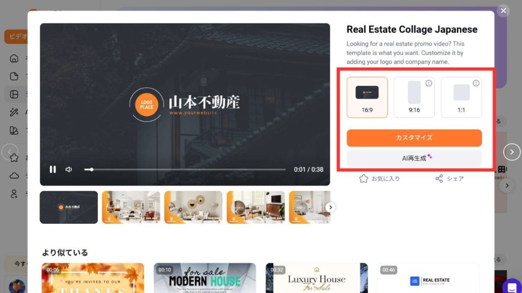 テンプレートが見つかったら、テンプレートをクリックし縦横比を選んでから、「カスタマイズ」を選択してください。カスタマイズ画面で写真やテキストを編集すると、テンプレートを利用した、自分だけの動画が作成できます。