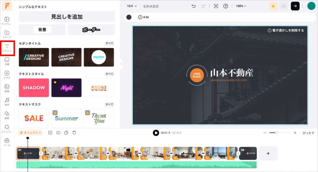 動画にテキストを入れる場合は、動画の編集画面を開き、左側のメニューから「テキスト」を選択します。するとシンプルなテキストか、アレンジされたテキストが選択できるので、気に入ったテキストスタイルを選びましょう。