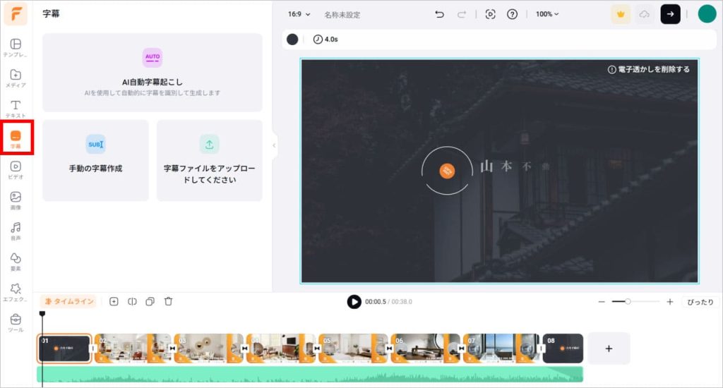 動画に字幕を入れる場合は、左側のメニューから「字幕」を選択します。「AI自動字幕起こし」は、AIを使い、動画の音声を自動的に聞き取って、字幕を生成する機能です。スピーディーな字幕制作が可能になるので、ぜひ使ってみてください。