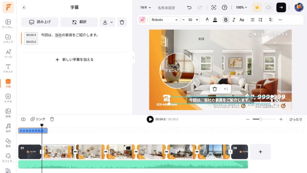 FlexClipでは、メニューや操作パネルはすべて日本語に対応しています。字幕生成やテキスト読み上げ機能も正確な日本語で生成できるため、使い勝手が非常に良いです。