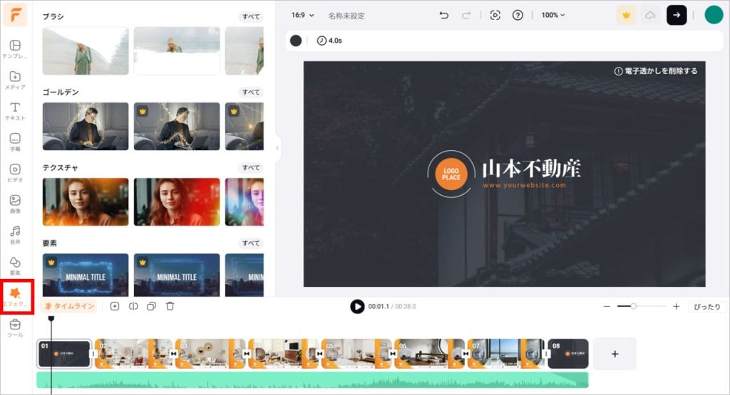 エフェクト機能を使う場合は、メニュー左側の「エフェクト」を選択します。複数のエフェクトが表示されるので、好きなエフェクトを選ぶことで、動画にすぐに反映されます。
