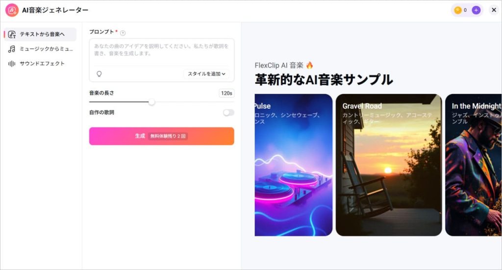 FlexClipのトップページから、「ビデオの作成」を選ぶと、マジックツールという項目が表示されます。マジックツール内の「AI音楽ジェネレーター」を選ぶと、AIを活用した音楽生成が可能です。