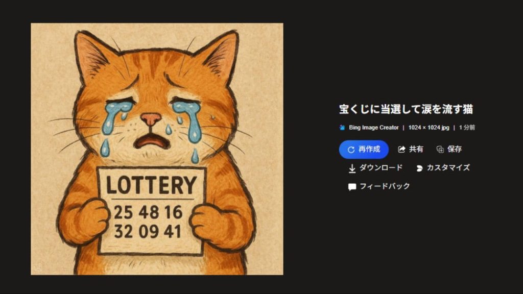 以前、「宝くじに当選して涙を流す猫」という日本語プロンプトを入力しましたが、その結果は以下のとおり。