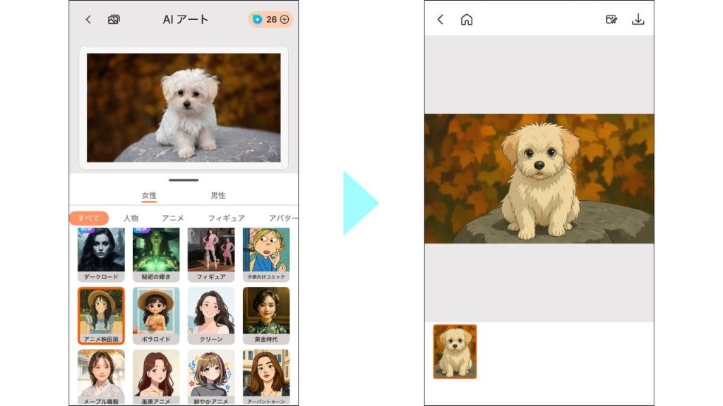 実際に、PhotoDirectorのアプリを使って、犬の写真をAIイラストにしてみました。