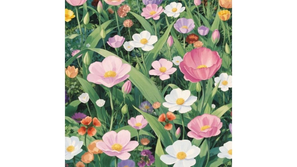 試しに、「色とりどりの花が咲き乱れる風景」と入力して、スタイルを「日本のアニメスタイル」に指定した結果は以下のとおりです。