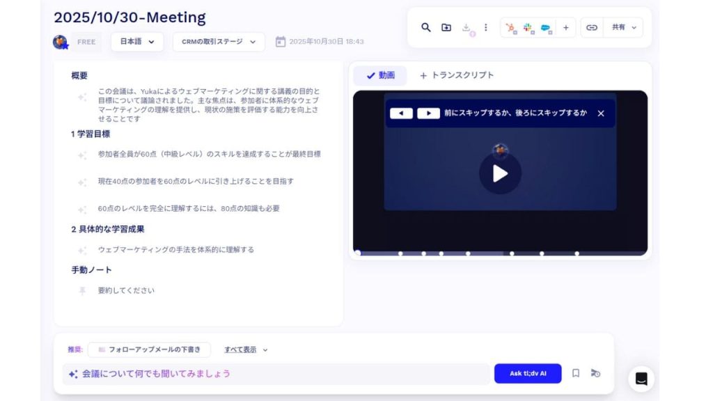 長時間の会議でも、tl;dvを使えば短時間で要点を把握でき、議事録として活用するのはもちろん、後から効率よく内容を確認したいときにも便利です。