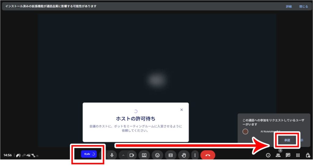クリック後、オンライン会議内に「ユーザー名 AI Notetaker」という、tl;dvの画面録画・保存を行うボットユーザーが参加許可を求めて入ってきます。参加をリクエストされたら、承認を押してください。