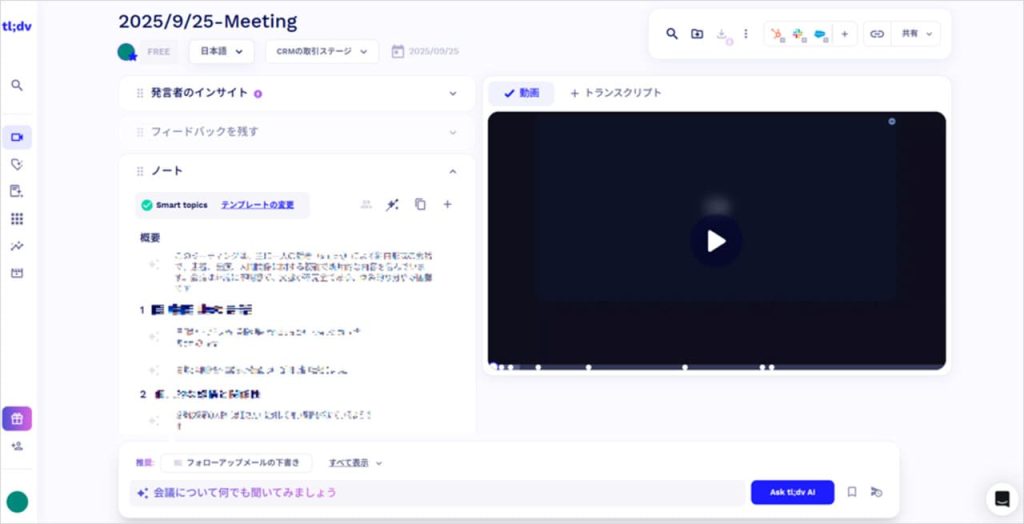 また、左側の「ノート」を開くと、動画の議事録・要約が表示されます。詳しく会話の流れを追いたいときには文字起こしを、大まかな内容を把握したいときにはノートをチェックするようにしましょう。