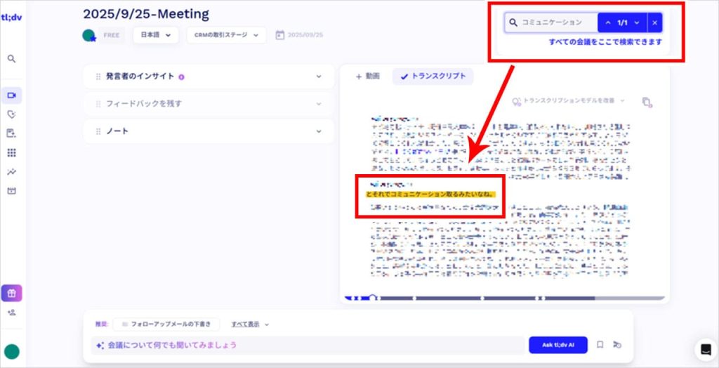tl;dvにはキーワード検索機能が備わっており、録画データや文字起こしの中から必要な情報にすぐにアクセスが可能です。