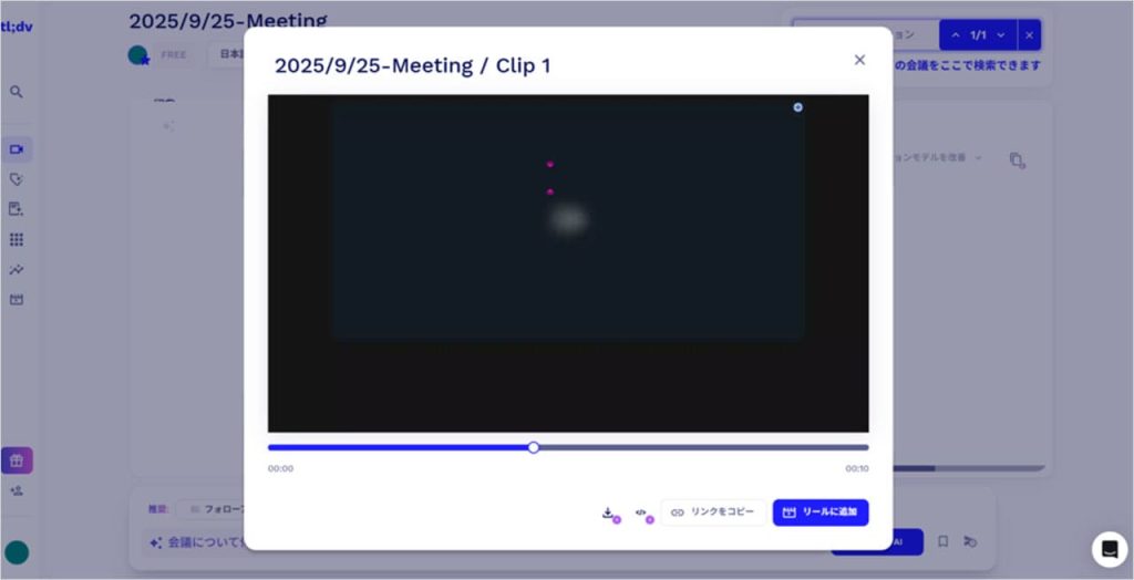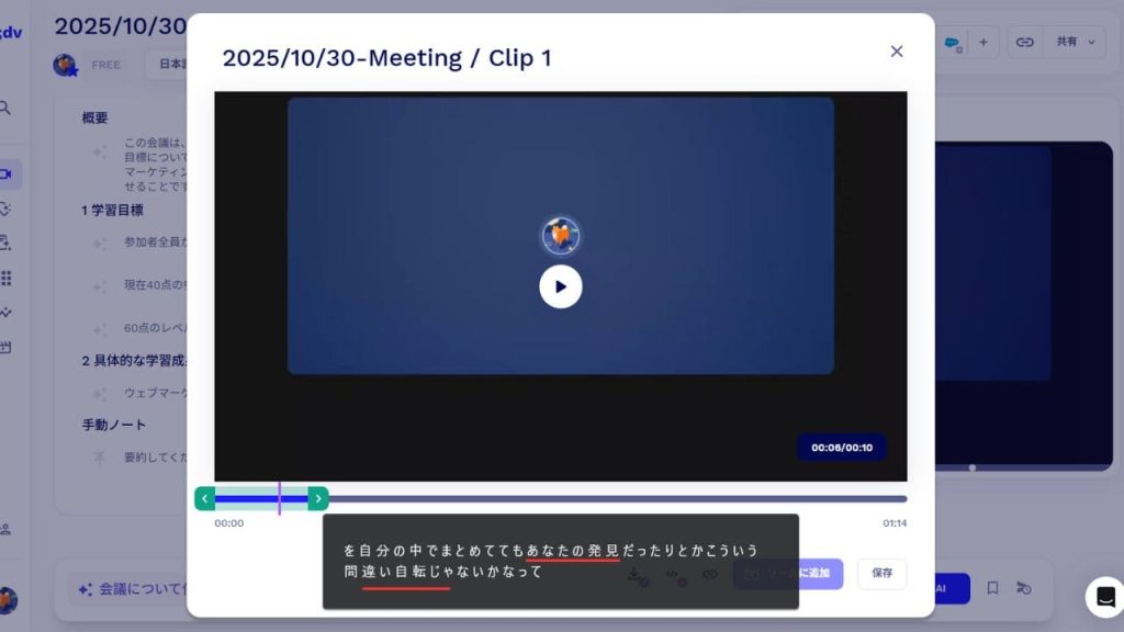 tl;dvでは、会議の重要な部分だけをハイライトとして切り出すことができます。例えば、結論が出た瞬間や重要な議論のポイントだけを抜き出して共有する、といった使い方が可能です。