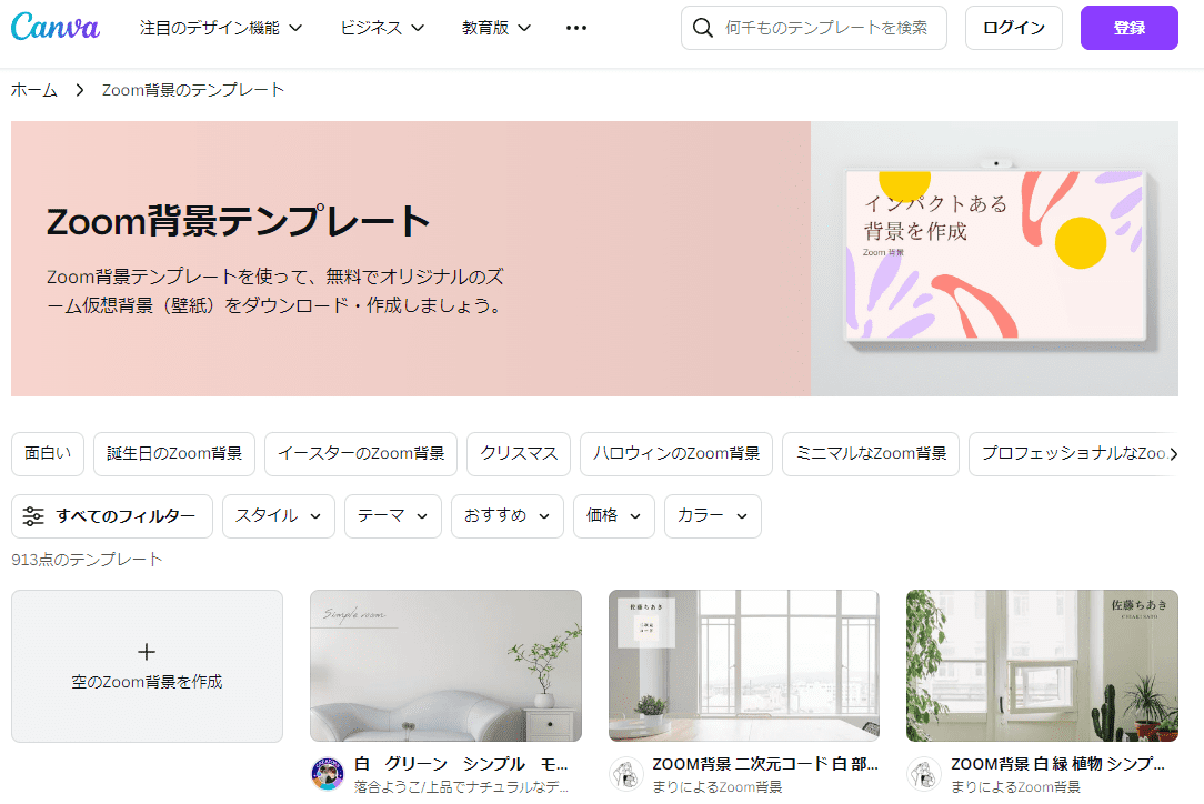 デザインツールで有名な「Canva」でも、Zoomバーチャル背景の特集ページが用意されています。白・青・ピンクなど落ち着いた色が基調のシンプルな背景が多いので、ビジネス利用もしやすいです。