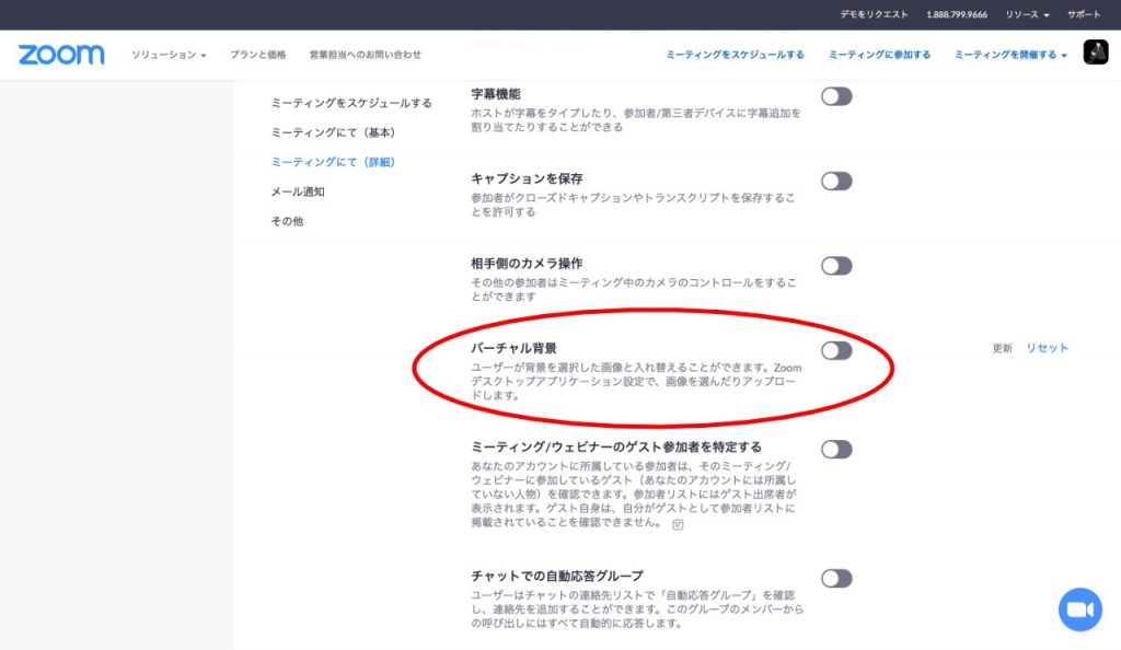 パソコンのブラウで利用する場合は、サイトからサインインして「マイアカウント」に入ってください。その後「設定」ページを開いて、バーチャル背景の項目をオン(青)に変更すればバーチャル背景を利用できます。ここで設定しておかないと、ビデオ通話画面に入ったときにバーチャル背景を選べません。