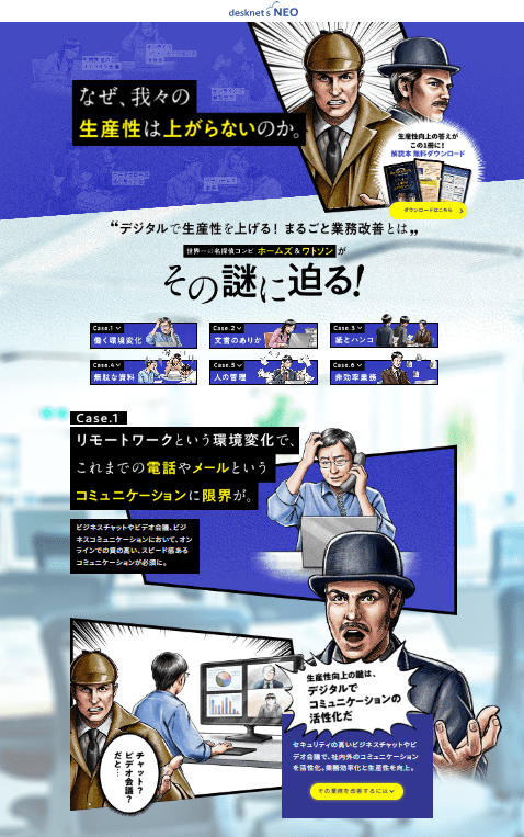 desknet’s NEOは、ユーザーの興味を引き読ませるLPとなっています。社内向けのグループウェアなのに、シャーロックホームズを起用してマンガ調に仕上げている独特なデザインです。どういう商品かわからないからこそ、あえて目立たせて内容を読ませるという高度なテクニック。イラストを描けるデザイナーならチャレンジしても良さそうです。
